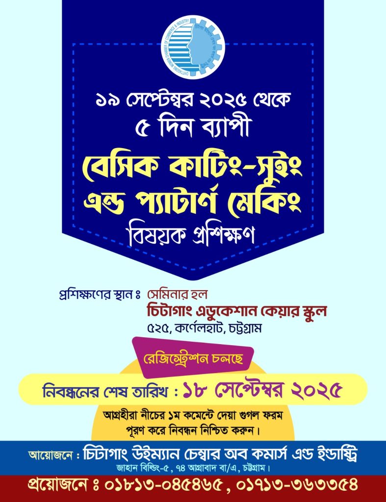 Chittagong Women Chamber Of Commerce & Industry (CWCCI) এর উদ্যোগে এবং এসএমই ফাউন্ডেশনের সহযোগিতায় আগামী ১৯ সেপ্টেম্বর ২০২৫ থেকে ৫ দিনব্যাপী শুরু হতে যাচ্ছে ‘‘বেসিক কাটিং-সুইং এন্ড প্যাটার্ণ মেকিং” বিষয়ক প্রশিক্ষণ।